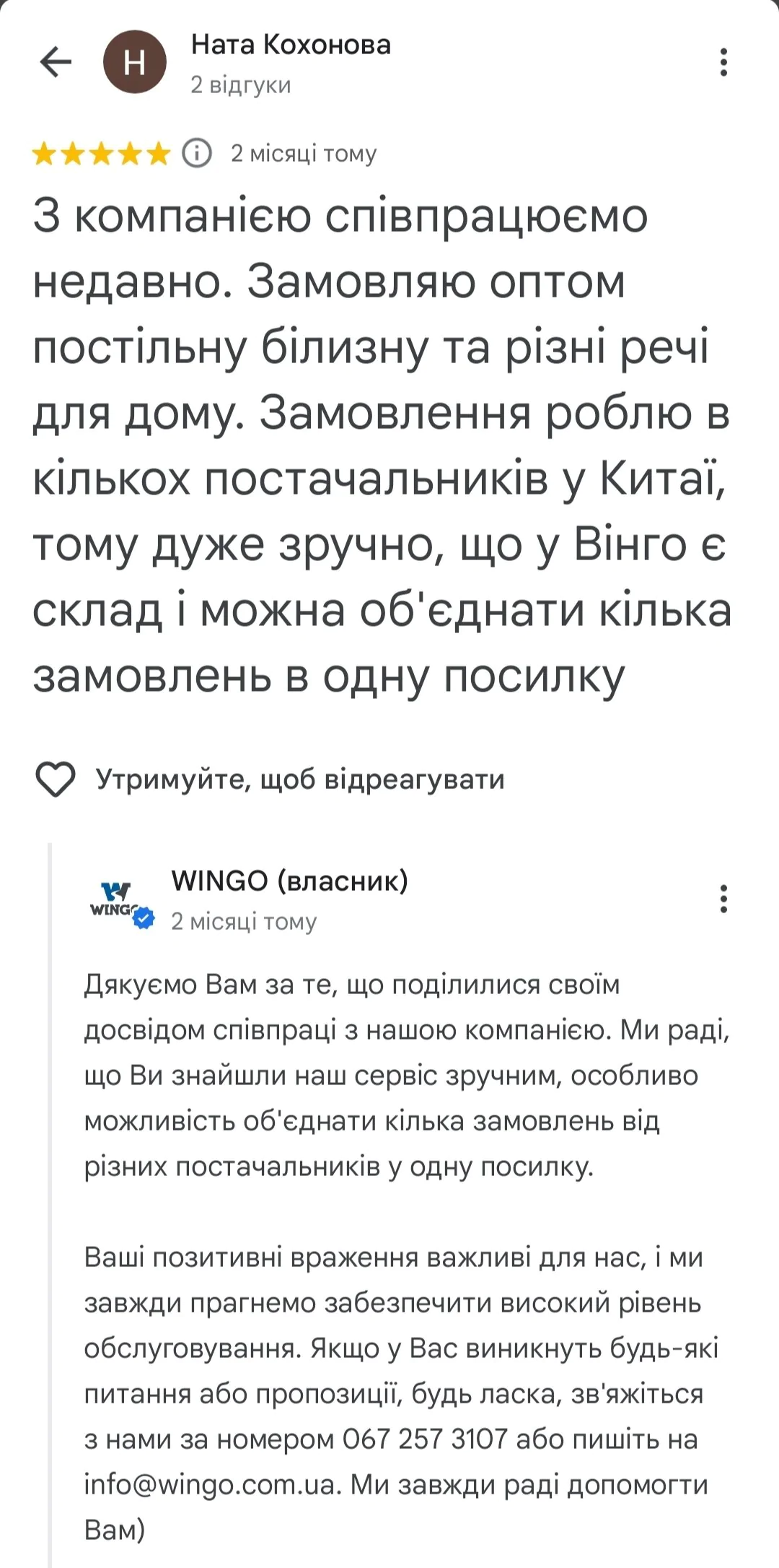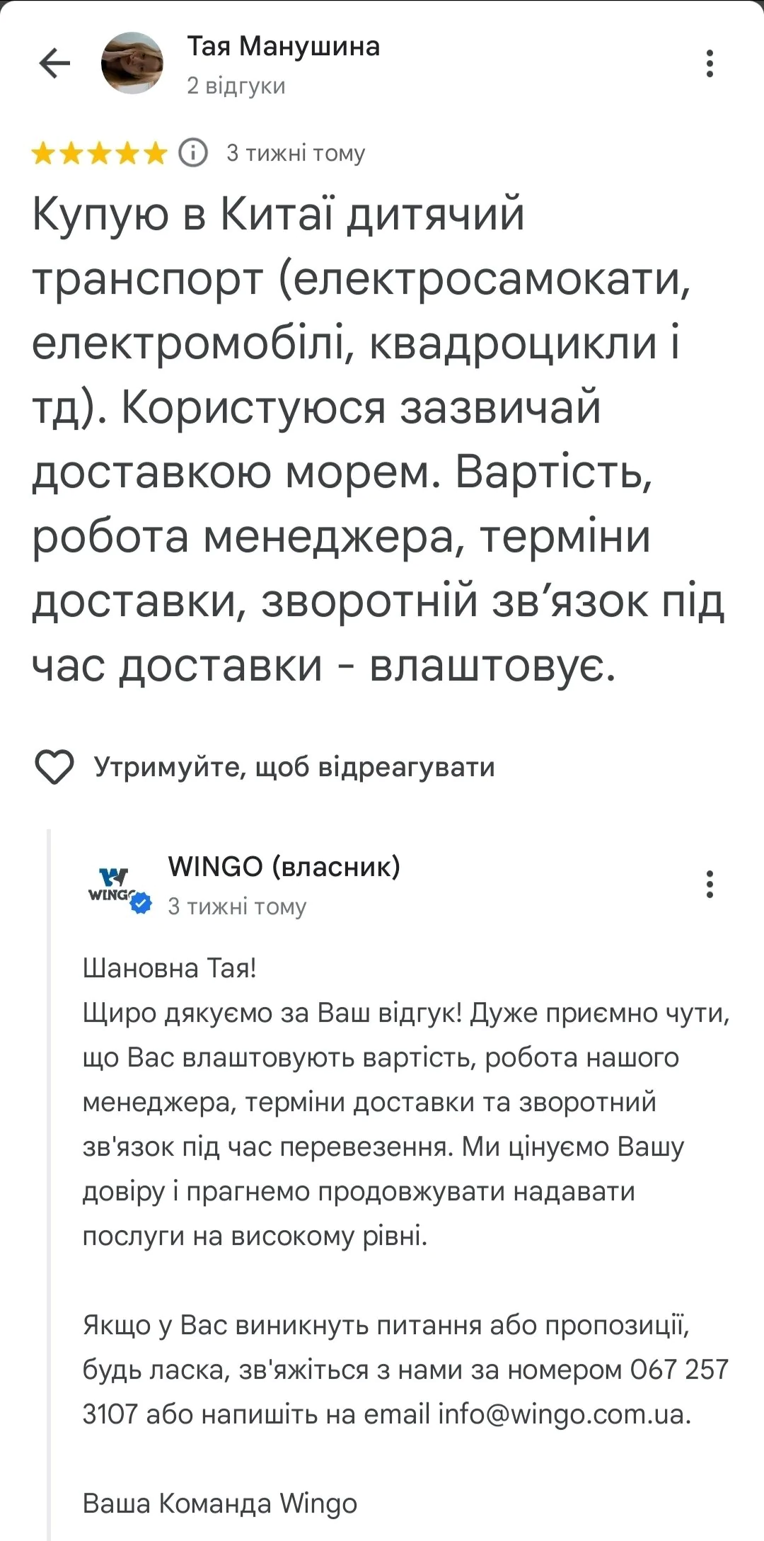 Привіт! Мене звати Вікторія, і я власниця інтернет-магазину роздрібних товарів для дому в Україні. Хочу поділитися своїм чудовим досвідом співпраці з компанією Wingo по оптовій доставці вантажів з Китаю. Нещодавно я скористалась послугами швидкої доставки вантажу від Wingo і мій товар прибув на склад всього-на всього за 8 днів від замовлення і це надзвичайно швидко враховуючи реальність нашого життя зараз. Це в рази швидше, ніж попередні мої поставки морем, які займали приблизно 1,5 місяці. Чудово, що є можливість так швидко отримувати замовлення з Азії, чути позитивні відгуки від клієнтів і бачити як вони звертаються до нас ще! Хочу сказати про послугу "під ключ" від Wingo. Компанія бере на себе всі мороки з паперами, включаючи митне оформлення вантажів. Ти можеш просто делегувати це профі і займатися своїми бізнес-справами. Це реально зручно і економить купу часу. Також хочу відзначити роботу особистого менеджера Wingo. Вона завжди на прямому контакті зі мною і готова надати підтримку в будь-якій ситуації. Це дуже важливо, коли займаєшся бізнесом і потребуєш оперативних рішень. Дякую компанії Wingo за відмінний сервіс і професіоналізм. Ваша допомога робить мій бізнес успішним. Щиро вдячна!